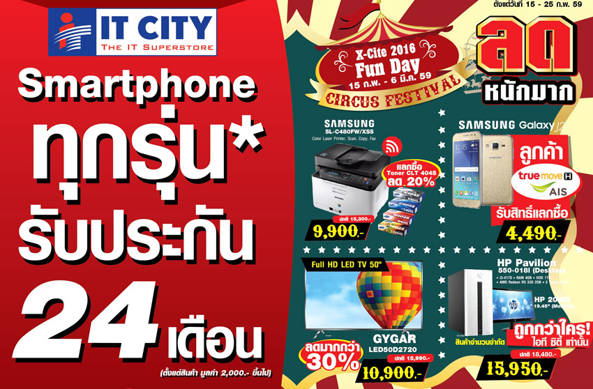 บริษัทไอที ซิตี้ จำกัด (มหาชน) เมืองเทคโนโลยีครบวงจรเปิดเผยว่า ไอที ซิตี้ได้จัดกิจกรรม Fun Park สวนสนุกและโรงละครสัตว์แบบฝรั่ง เชื่อมความสนุกสนานผสมความคลาสสิคเข้าด้วยกัน ในงาน X-Cite2016 Fun Day Circus Festival ตั้งแต่วันนี้จนถึง 6 มีนาคมนี้ ที่ไอที ซิตี้และไอที ซิตี้โมบายทั่วประเทศ เพื่อเป็นการสร้างกลยุทธ์ทางการตลาดและปลุกกระแสวงการไอทีช่วงต้นปีร่วมกับพันธมิตรทางธุรกิจหลากหลายแบรนด์ดัง อาทิ ซัมซุง เอเซอร์ เอปสัน เอซุส แคนนอน เดลล์ เลอโนโว เอชพี เอเซอร์ เป็นต้น สำหรับกิจกรรมเด่น ๆ ในงานประกอบด้วย กิจกรรมวงล้อมหาสนุก โดยลูกค้าจะได้รับสิทธิ์เมื่อซื้อสินค้าจะได้หมุนวงล้อ ทุก 5,000 บาท ต่อ 1 ครั้ง (สำหรับสาขาใหญ่ที่ร่วมรายการ) และลูกค้าที่ซื้อสินค้าจะได้หมุนวงล้อ ทุก 3,000 บาท ต่อ 1 ครั้ง (สำหรับสาขาย่อยที่ร่วมรายการ) กิจกรรมนาทีทอง พบสินค้าราคาพิเศษนำมาลดแล้วลดอีก โดยเฉพาะทีวีแอลอีดี 32 นิ้ว ราคา 6,990 บาท ,ทีวีแอลอีดี 42 นิ้ว ราคา 10,990 บาท เป็นต้น