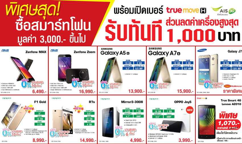 นอกจากนี้ยังมีสิทธิพิเศษสมาร์ทโฟนเมื่อเปิดเบอร์กับ TRUEMOVE H หรือ AIS รับส่วนลดราคาเครื่องสูงสุดทันที 1,000 บาท (เมื่อซื้อสมาร์ทโฟนมูลค่า 3,000 บาทขึ้นไป) สำหรับสมาร์ทโฟนที่ร่วมรายการ อาทิ เอซุส Zenfone Max ราคา 6,490 บาท , เอซุส Zenfone Zoom ราคา 16,990 บาท , SAMSUNG GALAXY A5 ราคา 13,900 บาท, SAMSUNG A7 ราคา 15,900 บาท , Acer Liquid X2LTE Luxury Gold ราคา 9,990 บาท ,Microsoft Lumia 950 ราคา 20,700 บาท และ Microsoft Lumia 950 XL ราคา 23,300 บาท (ทั้งสองรุ่น แลกซื้อ Display Dock HD -500 ราคา 1,900 บาท)