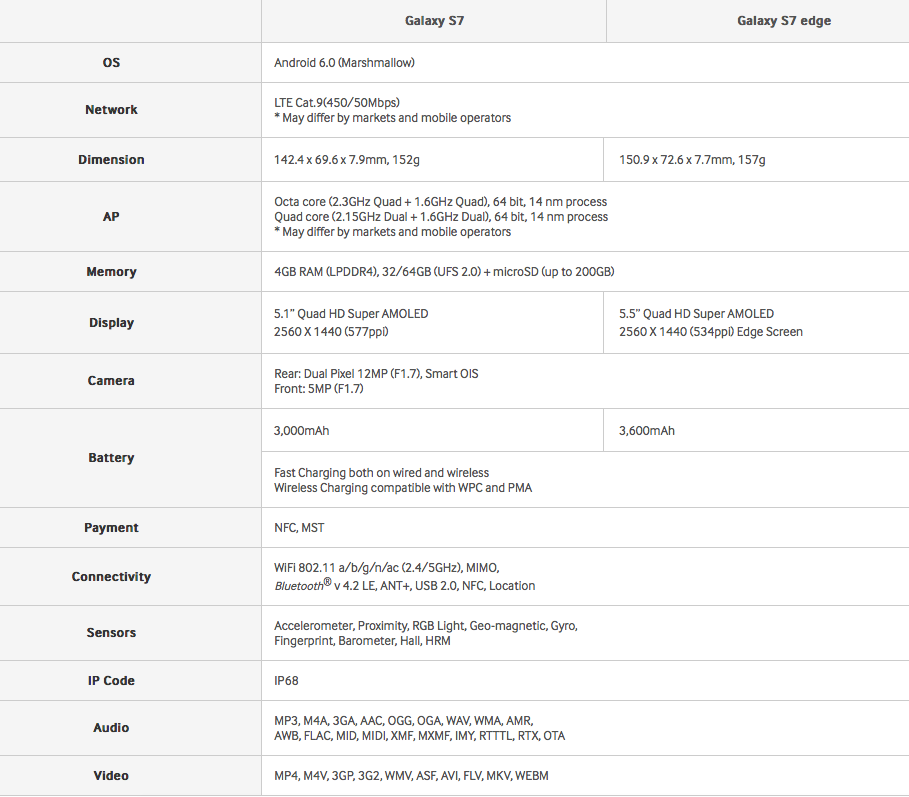 หลังจาก LG ได้เปิดตัว LG G5 ไปก่อนหน้าแล้ววันนี้ Samsung ก็ได้ทำการเปิดตัว Galaxy S7 และ Galaxy S7 edge อย่างเป็นทางการเช่นเดียวกัน ซึ่งข้อมูลต่างๆก็หลุดออกมาให้เห็นกันตั้งแต่ก่อนเปิดตัวกันไปหมดแล้ว ซึ่งสเปคต่างๆของทั้ง 2 รุ่นอย่างเป็นทางการมีดังต่อไปนี้