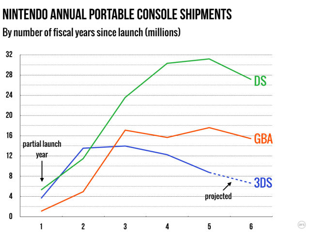 ซึ่งจากกราฟจะเห็นได้ว่าเมื่อเทียบยอดจำหน่ายของ Nintendo 3DS กับ Nintendo DS และ Game Boy Advanced จะเห็นว่ายอดจำหน่ายของ Nintendo 3DS ลดลงเร็วกว่าอย่างมาก ซึ่งผลกระทบส่วนหนึ่งก็มาจากเกมบนตลาดสมาร์ทโฟนที่มาแรงอย่างมากนั่นเอง จนทำให้ Nintendo ต้องหันมาลุยธุรกิจนี้ด้วยเช่นเดียวกัน คาดว่า Nintendo เตรียมนำเครื่องคอนโซลรุ่นใหม่ Nintendo NX มาลุยตลาดภายในปีนี้เพื่อชิงส่วนแบ่งกลับคืนอีกครั้ง