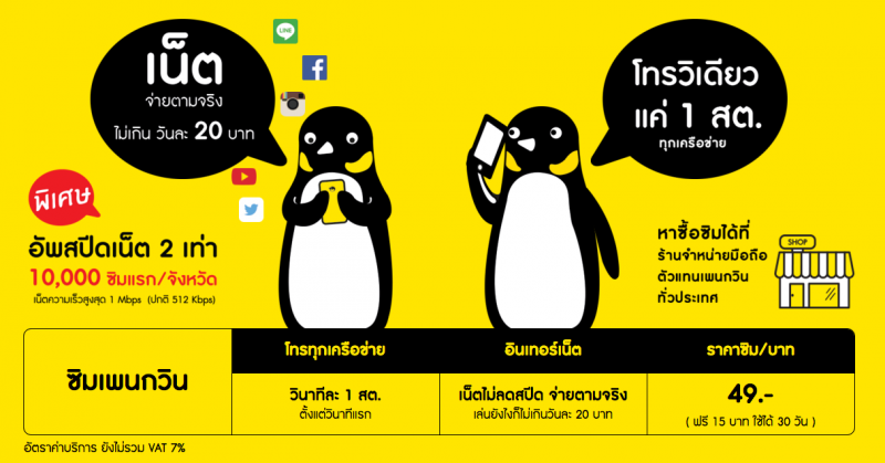 โปรโมชั่นช่วงเปิดตัวซิมเพนกวิน 10,000 ซิมแรกของทุกจังหวัดจะได้เล่นเน็ตแรง 2 เท่าได้ความเร็วสูงสุด 1 Mbpsจากปกติ 512 Kbps สามารถใช้งานอินเทอร์เน็ตได้โดยไม่ลดความเร็วการใช้งานลง (FUP) อีกด้วย คิดค่าใช้จ่ายตามจริงไม่เกินวันละ 20 บาท (ค่าอินเทอร์เน็ต 1 MB = 25 สตางค์ ) โทรได้วินาทีละ 1 สตางค์ ทุกเครือข่าย