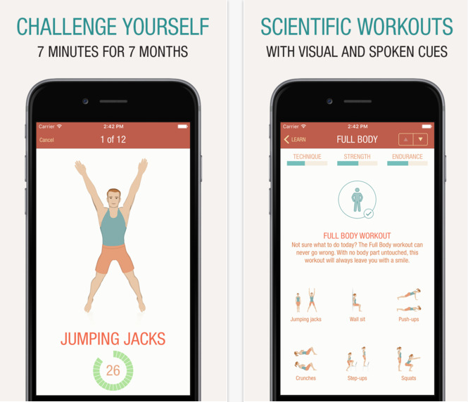 ปิดท้ายด้วยแอพที่เอาใจคนที่ชอบออกแบบกำลังกายหนักๆแบบต่อเนื่องกับแอพ 7 Minute Workout แอพนี้จะมีการรวบรวมท่าออกกำลังต่อเนื่องภายใน 7 นาทีอาทิ กระโดดตบ นั่งพิงกำแพง วิดพื้นเป็นต้นโดยจะมีภาพกราฟฟิคให้ดูว่าต้องทำท่าไหนนอกจากนี้ยังมีโค้ชผู้ช่วยจากในแอพคอยพูดแนะนำตลอดเวลา และสามารถเลือกได้ว่าจะเอาโค้ชแนวไหนแบบโหดหรือนุ่มนวล เพิ่มสีสันขณะออกกำลังกายได้เป็นอย่างดี โดยแต่ละท่าจะพักได้ 10 วินาทีก่อนเริ่มท่าต่อไป รับรองสนุกมากแอพนี้