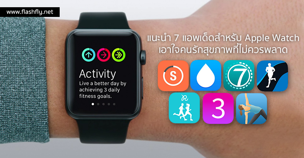 วันนี้ทีมงาน @flashfly มีแอพเด็ด 7 แอพอาใจคนรักสุขภาพสำหรับผู้ที่ใช้งาน Apple Watchโดยปกติในการออกกำลังกายในแต่ละวัน Apple Watch จะมีการแจ้งเตือนผ่านทางแอพ Activity หรือกิจกรรม ที่จะแสดงภาพสรุปข้อมูลกิจกรรมที่ทำในแต่ละวันเป็นวงแหวนทั้งสามวงดังนี้ ยืน (สีฟ้า) เคลื่อนไหว (สีแดง) ออกกำลังกาย (สีเขียว) โดยเป้าหมายคือพยายามทำให้วงแหวนเต็มในทุกวันให้ได้