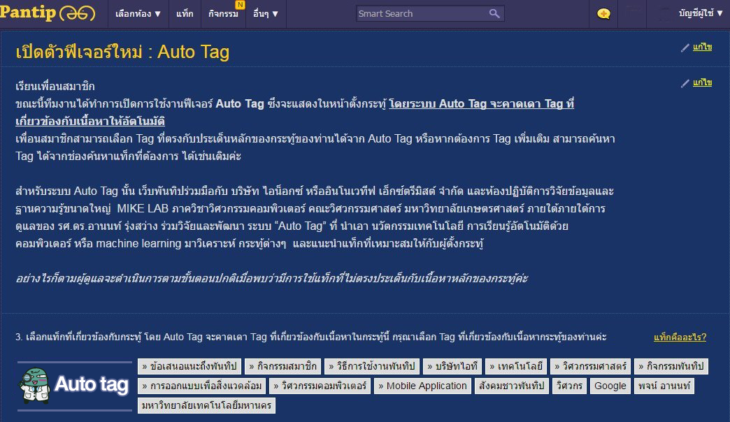 โดย Pantip.com ได้สร้างความร่วมมือกับบริษัท ไอน็อกซ์ หรืออินโนเวทีฟ เอ็กซ์ตรีมิสต์ จำกัด และห้องปฏิบัติการวิจัยวิศวกรรมสารสนเทศและความรู้ขนาดใหญ่ (MikeLab : Massive Information & Knowledge Engineering Laboratory) ภาควิชาวิศวกรรมคอมพิวเตอร์ คณะวิศวกรรมศาสตร์ มหาวิทยาลัยเกษตรศาสตร์ ภายใต้การดูแลของ รศ.ดร.อานนท์ รุ่งสว่าง ร่วมวิจัยและพัฒนาระบบ “Auto Tag” ที่นำเอานวัตกรรมเทคโนโลยี Big Data Analytics ผนวกกับเทคโนโลยีเครื่องจักรเรียนรู้ (machine learning) มาวิเคราะห์ กระทู้ต่างๆ และแนะนำแท็กที่เหมาะสมให้กับผู้ตั้งกระทู้