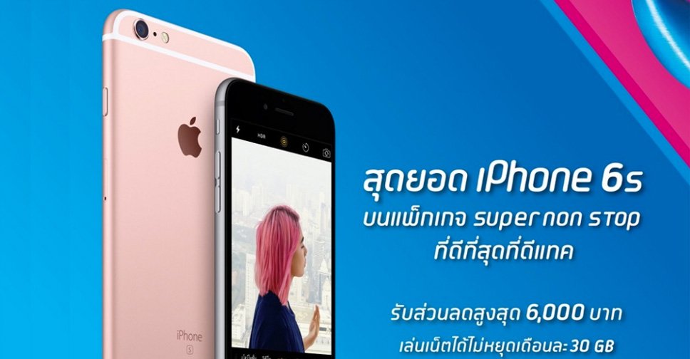 สุดยอด iPhone 6s บนแพ็กเกจ Super non stop ที่ดีที่สุดที่ dtac รับส่วนลดสูงสุด 6,000 บาท เล่นเน็ตได้ไม่หยุดเดือนละ 30 GB เมื่อซื้อพร้อมสมัครแพ็กเกจรายเดือนขั้นต่ำ 899 ขึ้นไป และชำระค่าบริการล่วงหน้า 4,000 บาท โดยค่าบริการรายเดือนล่วงหน้าที่ชำระจะถูกแบ่งหักเป็นส่วนลดค่าบริการรายเดือน 10 เดือน ระยะสัญญา 12 เดือน