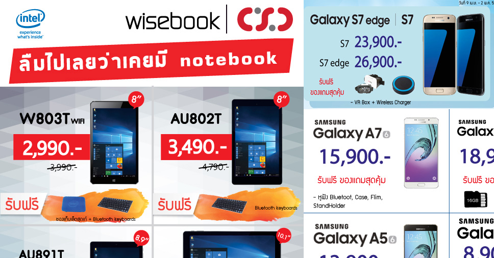 ยังไม่หมดเพียงเท่านี้ ทาง CSC ยังจัดโปรโมชั่นสุดพิเศษของ wisebook มาลดกระหน่ำช่วงปิดเทอมกัน wisebook แท็บเล็บบนระบบปฏิบัติการตัวล่าสุดกับ Microsoft Window 10 ขับเคลื่อนด้วยขุมพลังจากอินเทล คุณสมบัติการใช้งาน ขนาดที่กระทัดรัด ทำให้สะดวกในการพกพา ในราคาสุดประหยัด นำมาให้ช็อปกันมากมายหลายรุ่น เริ่มต้นเพียง 2,990 บาท จัดของแถมกันแบบจุใจ เริ่มตั้งแต่วันนี้ ด่วน!สินค้ามีจำนวนจำกัด