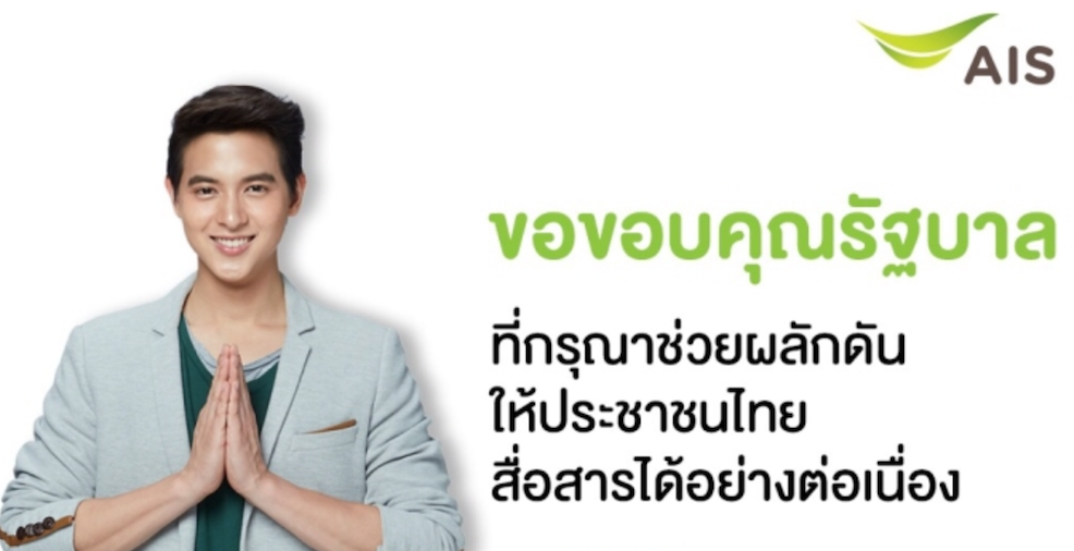 เอไอเอส ขอบคุณรัฐบาล ช่วยดูแลคนไทยให้ใช้งานมือถือได้อย่างต่อเนื่อง โดยพนักงานเอไอเอสทุกคนยังคงเดินหน้าดูแลลูกค้าทุกวิถีทาง เพื่อให้พร้อมรับการเปลี่ยนเทคโนโลยีสู่ 3G/4G อีกทั้งยืนยันเจตนารมณ์ในการดูแลผลประโยชน์ของประเทศ เชื่อมั่นเป็นประโยชน์กับทุกฝ่าย
