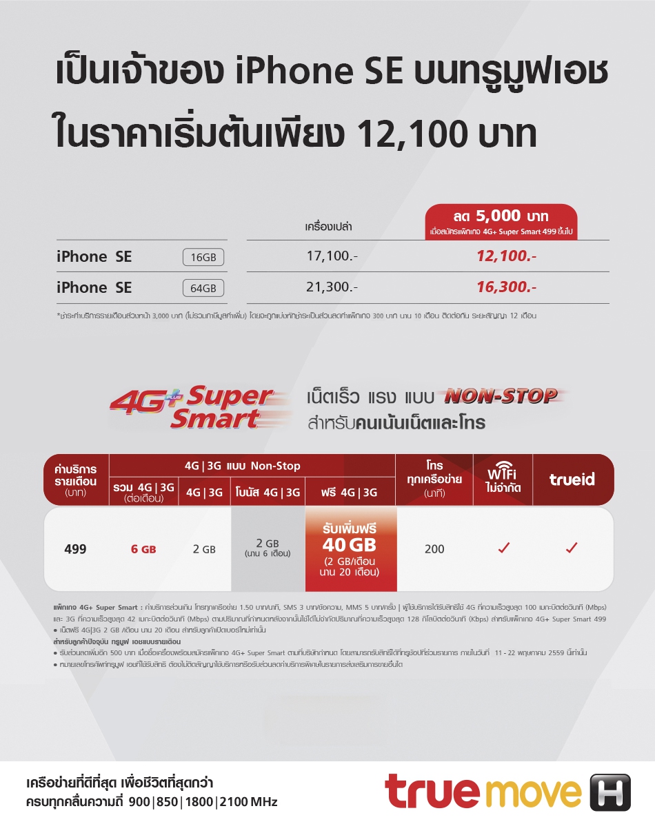 จากราคาข้างต้นจะเห็นได้ว่ามีราคาสูงกว่า Apple Online Store จำหน่ายที่ 16,800 และ 20,800 บาท แต่ Truemove H ยังมีราคาพิเศษลดทันที 5,000 บาท เมื่อสมัครแพคเกจ 4G+ Super Smart 499 ขั้นไป ทำให้มีราคาเครื่องลดลงมาดังนี้