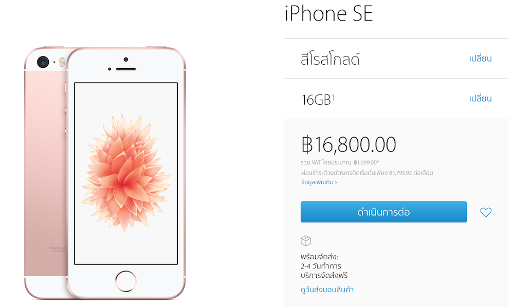 วันนี้เป็นวันแรกที่ร้านค้าออนไลน์ Apple Online Store ประเทศไทยได้ทำการวางจำหน่าย iPhone SE อย่างเป็นทางการแล้วหลังจากที่เปิดราคามาให้ทราบก่อนหน้าไปเมื่อหลายสัปดาห์ก่อน โดยมีราคาดังต่อไปนี้
