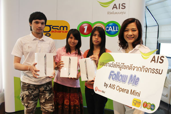เอไอเอส โดย นางเบญจพร กำเพ็ชร ผู้จัดการฝ่ายการตลาดกลุ่มลูกค้าโพสต์เพด มอบรางวัล iPad 2 Wi-Fi+3G 16GB ให้ลูกค้าจีเอสเอ็ม แอดวานซ์ และวัน-ทู-คอล! ผู้โชคดี จากกิจกรรม “Follow me by AIS Opera Mini” ที่โพสต์ภาพในรูปแบบ “Follow” และได้รับคะแนนโหวตจากชาวออนไลน์มากที่สุด 4 ท่าน สามารถติดตามกิจกรรมที่น่าสนใจ ได้ที่ www.facebook.com/gsmadvance และ www.facebook.com/12call