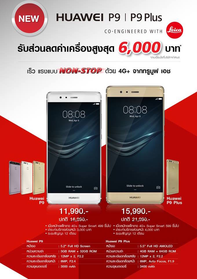 - Huawei P9 Plus จอ 5.5 นิ้ว แรม 4GB เมม 64GB ราคา 21,990 บาท ลดเหลือ 15,990 บาท เมื่อสมัครแพคเกจ 4G+ Super Smart 599 ขึ้นไป ชำระค่าบริการล่วงหน้า 4,000 บาท ติดสัญญา 12 เดือน