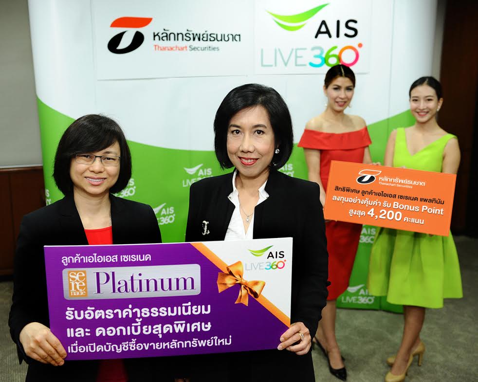 เอไอเอส โดย คุณบุษยา สถิรพิพัฒน์กุล รองกรรมการผู้อำนวยการ สายงานบริหารลูกค้าและการบริการ ร่วมกับ บมจ.ธนชาต โดย คุณพิมพ์ผกา นิจการุณ กรรมการผู้จัดการ ธุรกิจนายหน้าค้าหลักทรัพย์ เดินหน้าเติมความพิเศษในแคมเปญ AIS LIVE 360° ด้วยการมอบสิทธิพิเศษให้ ลูกค้าเอไอเอส เซเรเนด แพลทินัม ลงทุนอย่างคุ้มค่า โดยรับ Bonus Point สูงสุด 4,200 คะแนน หรือบัตรของขวัญมูลค่าสูงสุด 2,000 บาท พร้อมอัตราค่าธรรมเนียม และดอกเบี้ยสุดพิเศษ เมื่อเปิดบัญชีซื้อขายหลักทรัพย์ใหม่กับบริษัทหลักทรัพย์ธนชาต ตั้งแต่วันนี้ – 31 ธ.ค 59 ดูรายละเอียดเพิ่มเติมได้ที่ www.ais.co.th/serenade/thanachart