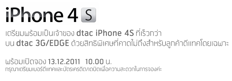 เตรียมพร้อมเป็นเจ้าของ iPhone 4S ที่เร็วกว่าบน dtac 3G/EDGE ด้วยสิทธิพิเศษที่คาดไม่ถึงสำหรับลูกค้าดีแทคโดยเฉพาะ พร้อมเปิดจอง 13.12.2011 10.00 น. กรุณาเตรียมเบอร์ดีแทคและบัตรเครดิท/เดบิทเพื่อความสะดวกในการจองค่ะ