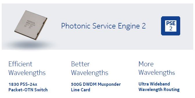 ในเครือข่ายของตนให้ได้มากที่สุดได้อย่างชาญฉลาด ทั้งนี้โนเกียได้ออกแบบ PSE-2 ออกมาสองรุ่นคือ PSE-2 Super Coherent (PSE-2s) มาพร้อมประสิทธิภาพสูงสุด และมีความยืดหยุ่นรองรับการใช้งาน ที่ต้องการการรับส่งข้อมูลจำนวนมาก และอาจมีประเด็นเรื่องระยะการใช้งานทางที่ห่างไกลเข้ามาเกี่ยวข้อง สามารถตั้งโปรแกรมการใช้งานได้เจ็ดรูปแบบไม่ซ้ำกัน เพื่อรองรับช่วงคลื่นส่วนทรานสปอร์ตตั้งแต่ความเร็ว 100G จนถึง 500G และตั้งระยะทางการใช้งานได้ตั้งแต่โครงข่ายในเมืองไปจนถึงระยะทางที่ไกลออกไปมาก เป็นการรับส่งข้อมูลแบบ Single carrier 400G รายแรกของโลก ให้ความเร็ว 200G สำหรับการใช้งานที่ Long Haul เป็นรายแรกของโลก และความเร็ว 100G สำหรับ Ultra-long haul รายแรกในโลกเช่นกัน นอกจากนี้ PSE-2s นี้จะช่วยลดค่าใช้จ่ายต่อบิตต่อกิโลเมตรโดยการขยายความจุสูงสุดในทุกระยะทาง ในขณะที่ใช้พลังงานน้อยลง 50 เปอร์เซ็นต์