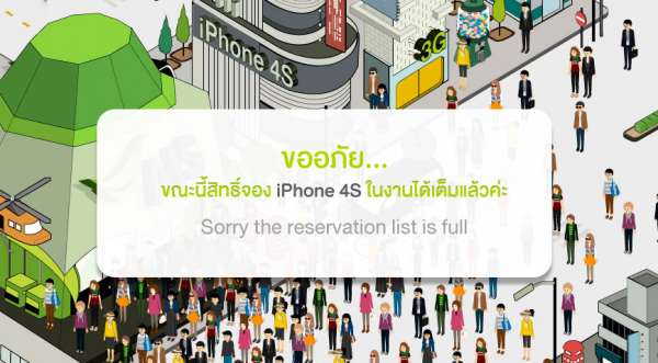 หลังจากที่ AIS ได้ประกาศเปิดให้สั่งจอง iPhone 4S ในวันนี้เวลา 9.00 น.เป็นต้นไป ก็ได้เสียงตอบรับจากผู้ที่ต้องการเป็นเจ้าของ iPhone 4S อย่างล้นหลามถึงขนาด Server ล่มหลายครั้ง หลายคนพลาดโอกาศจองเนื่องจากปัญหาการจราจรบนเว็บไซต์ AIS ที่หนาแน่นมากๆ ล่าสุดเมื่อเวลา 10.40 น. AIS ก็ขึ้นข้อความที่หน้า www.ais.co.th/iPhone4s ว่า “ขออภัย…ขณะนี้สิทธิ์จอง iPhone 4S ในงานได้เต็มแล้วค่ะ” “Sorry the reservation list is full”