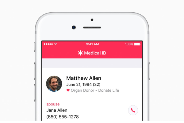 แอพ Health บน iPhone นำข้อมูลสุขภาพและการออกกำลังกายของคุณมาไว้ในที่เดียว แอพจะบรรจุ Medical ID ซึ่งทำให้ผู้เข้าช่วยเหลือในกรณีฉุกเฉินได้รับข้อมูลสุขภาพที่สำคัญ โดยสามารถเข้าถึงได้จากหน้าจอ lock screen ข้อมูลทางการแพทย์ หรือ Medical ID สามารถแสดงกลุ่มข้อมูลต่างๆ เช่น สภาวะทางสุขภาพ การแพ้ การใช้ยา กลุ่มเลือด และหมายเลขติดต่อยามฉุกเฉิน iOS 10 ทำให้ Medical ID มอบความสามารถในการลงทะเบียนเป็นผู้บริจาคอวัยวะ ดวงตา และเนื้อเยื่อ กับ Donate Life America อีกด้วย