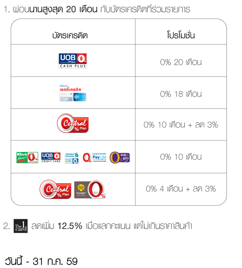 หรือพบโปรโมชั่นพิเศษได้ที่ พาวเวอร์บายทุกสาขา พร้อมโปรแกรมผ่อนนานสูงสุด 20 เดือนกับบัตรเครติดที่ร่วมรายการ พิเศษสำหรับผู้ถือบัตร The 1 Card ลดเพิ่ม 12.5% เมื่อแลกคะแนนสะสม แต่ไม่เกินราคาสินค้า โดยโปรโมชั่นพิเศษนี้เริ่มตั้งแต่วันนี้ – 31 ก.ค. 59