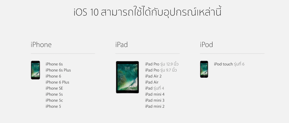 แต่ก่อนอื่นต้องตรวจสอบให้แน่ใจว่าอุปกรณ์ iOS ทั้ง iPhone,iPad หรือ iPod Touch ที่จะนำมาติดตั้ง iOS 10 Public Beta 1 นั้นรองรับตามที่ Apple ได้ประกาศออกมา