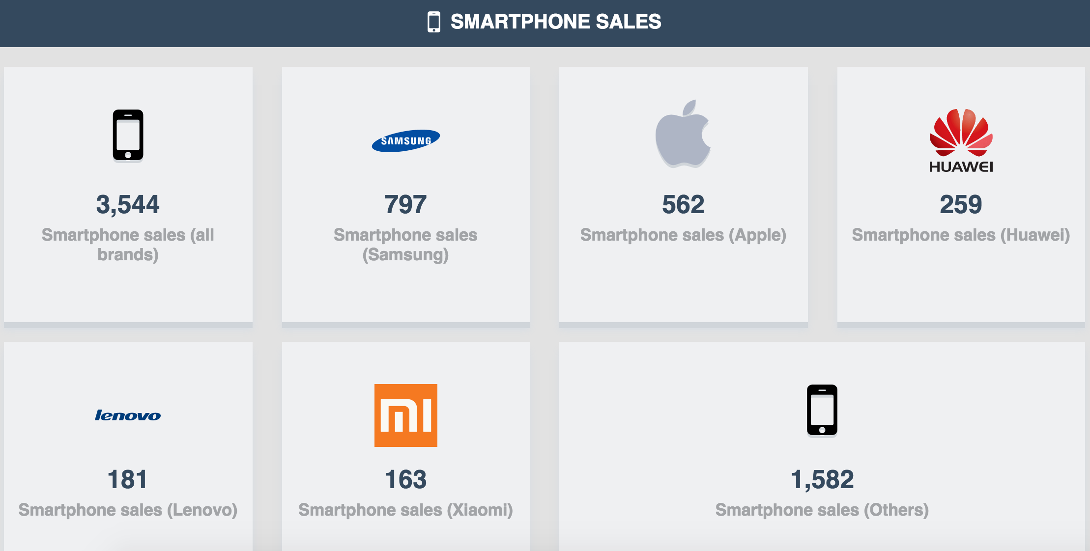 ยอดขายสมาร์ทโฟนแบบเรีบลไทม์ก็มีให้ดู ทั้ง Samsung, Apple, Huawei, Lenovo, Xiaomi และยอดขายรวมจากทุกค่าย การชำระเงินออนไลน์ก็ถูกรวบรวมข้อมูลเอาไว้ด้วย ไม่ว่าจะเป็นการซื้อสินค้า Amazon หรือ Alibaba การใช้บริการรถแท็กซี่ Uber หรือ Grabtaxi และยอดสั่งซื้อ Starbucks ผ่านมือถือ
