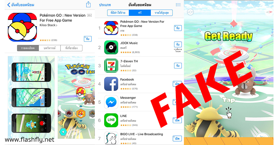 Pokémon GO เปิดให้ผู้ใช้งาน iOS ในประเทศไทยดาวน์โหลดแล้ว!! แต่ไม่ใช่ของแท้ มันเป็นของปลอม ไม่ได้มีความเกี่ยวข้องใดๆ กับเกม Pokémon GO เลยแม้แต่น้อย โดยมีชื่อเกมเต็มๆ ว่า “Pokémon GO : New Version For Free App Game” พัฒนาโดย Kiloo Stack และไม่น่าจะเกี่ยวกับ Kiloo ผู้พัฒนาเกม Subway Surfers ทั้งนี้เกม Pokémon GO ของแท้ จะใช้ชื่อแอพฯ ว่า “Pokémon GO” พัฒนาโดย Niantic, Inc. และยังไม่เปิดให้ดาวน์โหลดในประเทศไทย
