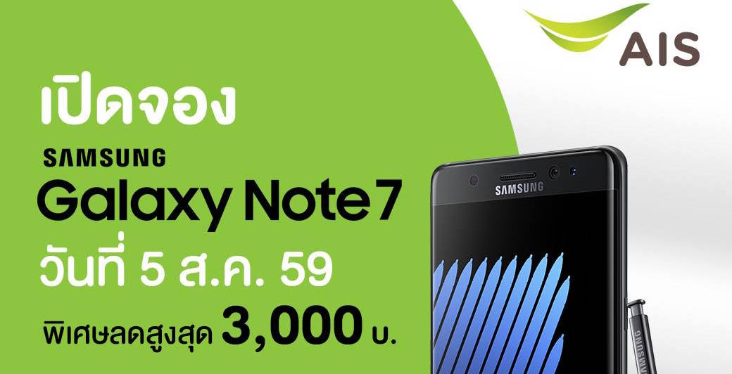 เปิดจอง Samsung Galaxy Note 7 ที่เอไอเอส วันที่ 5 ส.ค. นี้ รับส่วนลดสูงสุด 3,000 บาท พร้อมรับของพรีเมี่ยม เฉพาะ 400 ท่านแรกเท่านั้น รับสินค้าวันที่ 19 สิงหาคมนี้