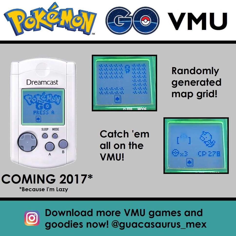 สำหรับเกม Pokémon GO เวอร์ชั่น Dreamcast VMU ได้รับการปรับแต่งโดยนักพัฒนาที่เรียกตัวเองว่า “guacasaurus_mex” ก่อนหน้านี้เขาเคยนำเกม Flappy Bird พอร์ทลง VMU สำเร็จมาแล้ว และเขาคาดว่าจะปล่อยเกม Pokémon GO ออกมาให้เล่นบน Dreamcast VMU ภายในปี 2017 โดยรูปแบบการเล่นจะมีการสร้างแผนที่ขึ้นมาให้แบบสุ่ม และมีการขว้าง PokéBall โดยการกดปุ่มแทนการสัมผัสหน้าจอ