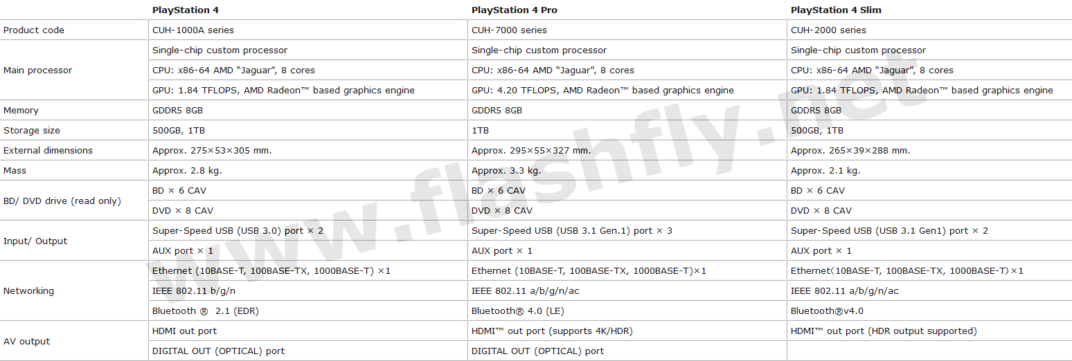 เปิดตัวไปแล้วเป็นที่เรียบร้อยสำหรับ PlayStation 4 Pro คอนโซลที่ได้รับการอัพเกรดจาก PlayStation 4 โดยเน้นไปที่การแสดงผล สนับสนุน HDR TV และคอนเท้นต์วีดีโอระดับ 4K ขณะที่เกมส์ก็ยังใช้ร่วมกับ PlayStation 4 รุ่นเดิมได้ และเพื่อให้มองเห็นความแตกต่างที่ชัดเจนขึ้น ทีมงานเว็บไซต์ Eurogamer จึงได้สรุปสเปกพร้อมเปรียบเทียบ PlayStation 4 Pro กับ PlayStation 4 รวมทั้งคอนโซลรุ่นอื่นๆ