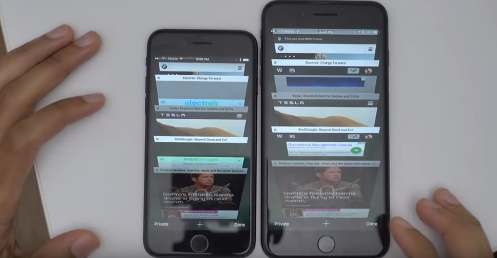 9to5mac นำ iPhone 7 กับ iPhone 7 Plus มาทดสอบการทำงานด้วยการเปิดแอพพลิเคชั่น Safari และเปิดเว็บไซต์ขึ้นมาหลายหน้าต่าง แล้วไล่กลับไปเปิดเว็บไซต์ทีละหน้าต่างของ iPhone ทั้ง 2 รุ่น เพื่อดูการตอบสนอง ซึ่งมันมีความเร็วที่ไม่ต่างกันเลย หรืออาจจะแตกต่างกันน้อยมาก
