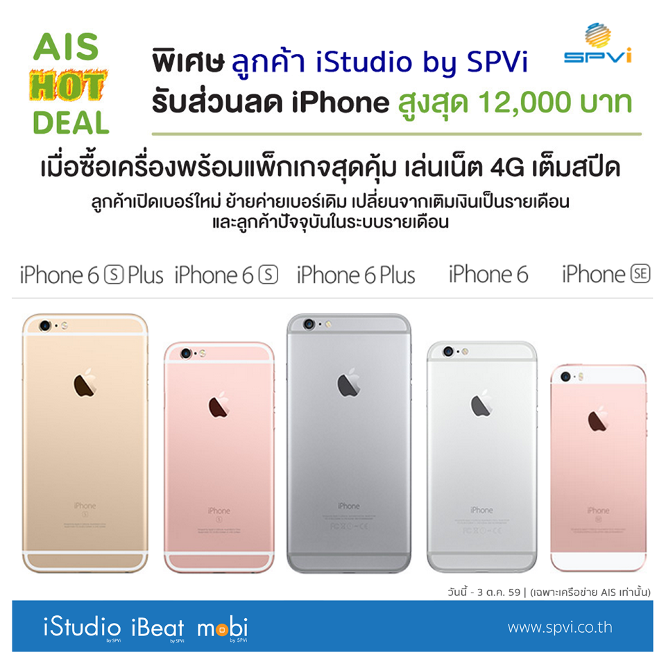 โปรโมชั่นสุดพิเศษ ลดแรงแซงทุกราคา สิทธิพิเศษสำหรับ ลูกค้า iStudio by SPVi เท่านั้น เป็นเจ้าของ iPhone ได้ในราคาลดสูงสุด 12,000 บาท เฉพาะที่ iStudio & iBeat by SPVi ทุกสาขา ตั้งเเต่วันนี้ – 3 ตุลาคม 2559 รายละเอียดเพิ่มเติม http://www.spvi.co.th/ais-hot-deat/