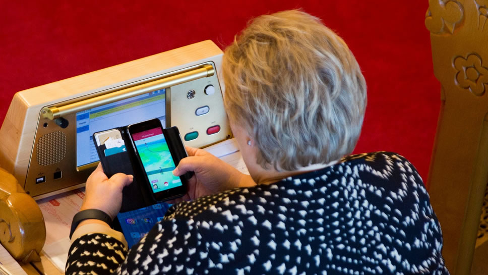 นายกรัฐมนตรีของนอร์เวย์ Erna Solberg กำลังก้มหน้าเพ่งจอสมาร์ทโฟนอย่างขมักเขม้น ระหว่างการประชุมในรัฐสภา Storting ของประเทศฯ ซึ่งเธอไม่ได้กำลังเช็คอีเมล แต่ภาพหน้าจอมันฟ้องว่ากำลังเล่นเกม Pokémon GO แหล่งข่าวรายงานว่าเธอเป็นแฟนพันธุ์แท้ของเกมนี้เลยทีเดียว