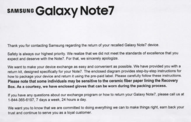 Return Kit มาพร้อมเอกสารแนะนำวิธีการบรรจุสมาร์ทโฟนเข้าไปในกล่อง ที่ต้องมีคู่มือเนื่องจากมันมีหลายกล่อง หลายชั้น รวมทั้งกล่องที่มีฉนวนกันความร้อน และยังแถมถุงมือป้องกันมาให้ด้วย ซึ่งในเอกสารระบุไว้ว่า ถุงมือที่แถมมาให้ อาจมีบางคนจำเป็นต้องใช้ เพราะไม่ถูกกับกระดาษใยเซรามิกที่บุไว้ในกล่อง