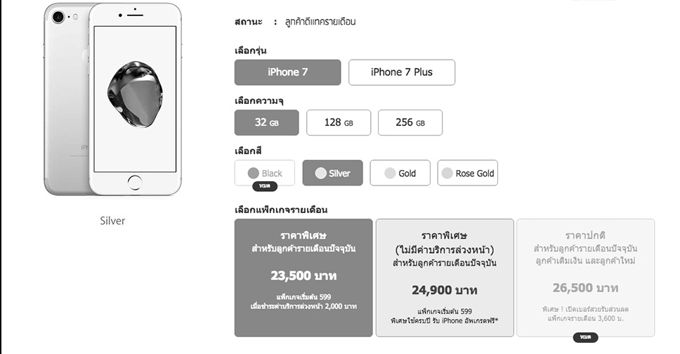 - ราคาพิเศษ (ไม่มีค่าบริการล่วงหน้า) สำหรับลูกค้ารายเดือนปัจจุบัน เริ่มต้น 24,900 บาท แพ็กเกจเริ่มต้น 599 พิเศษใช้ครบปี รับ iPhone อัพเกรดฟรี*