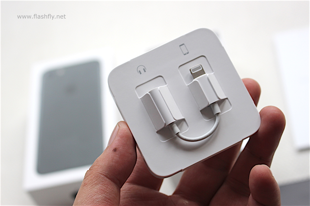 พลิกมาดูด้านหลังจะเห็นหัวแปลง Lightning to 3.5 mm Headphone Jack Adapter ให้สามารถนำเอาหูฟังทั่วไป ที่มีแจ็ค 3.5 มม.มาใช้งานร่วมกับ iPhone 7 และ iPhone 7 Plus ได้ ถ้าใครทำหายซื้อเพิ่มได้ในราคา 390 บาท