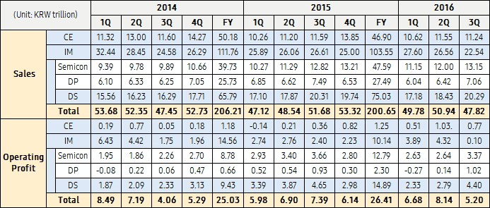ในส่วนของธุรกิจ IT & Mobile Communications (IM) มีรายได้อยู่ที่ 22.54 ล้านล้านวอน หรือราว 6.92 แสนล้านบาท ลดลง 4.02 ล้านล้านวอน หรือราว 1.23 แสนล้านบาท เมื่อเทียบกับไตรมาสที่ 2 ส่วนกำไรจากการดำเนินงานอยู่ที่ 1 แสนล้านวอน หรือราว 3 พันล้านบาท ลดลงถึง 4.22 ล้านล้านวอน หรือราว 1.29 แสนล้านบาท เมื่อเทียบกับไตรมาสที่ 2