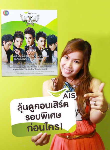 เอไอเอส เอาใจแฟนคลับ 5 ศิลปินสุดฮอต ทั้งณเดชน์, บอย-ปกรณ์, มาริโอ้, หมาก-ปริญญ์ และเคน-ภูภูมิ จัดคอนเสิร์ต “AIS Present Channel3 4+1 Superstar Concert” รอบพิเศษให้ลูกค้าลุ้นชมก่อนใคร ในวันศุกร์ที่ 3 ก.พ. 55 เวลา 20.00 น. ณ อิมแพ็คอารีนา เมืองทองธานี เพียงร่วมสนุกกับกิจกรรม “AIS 4+1 Superstar Photo Hunting” ปฏิบัติการค้นหาสุดยอดรูปถ่ายในแบบคุณกับ 5 ซุปเปอร์สตาร์ ทาง http://apps.facebook.com/ais-superstar ตั้งแต่วันที่ 5 ม.ค. 55 เป็นต้นไป