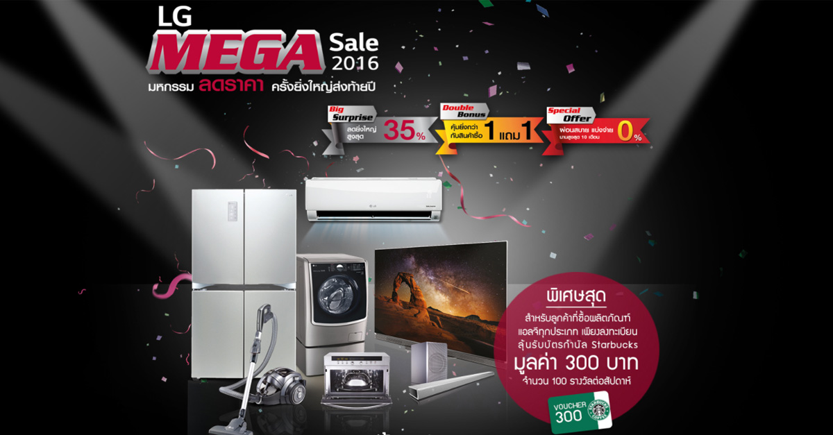 LG MEGA Sale 2016 ในครั้งนี้นั้น เรียกได้ว่าเป็นมหกรรมสินค้าลดราคาครั้งยิ่งใหญ่ส่งท้ายปีอีกหนึ่งงานที่น่าสนใจและไม่น่าพลาด เพราะทาง LG ได้ขนโปรโมชั่นเด็ดๆมาเอาใจลูกค้ากันเพียบ ไม่ว่าจะเป็น Big Surprise ลดยิ่งใหญ่สูงสุด 35% , Double Bonus คุ้มยิ่งกว่ากับสินค้าซื้อ 1 แถม 1 และ Special Offer ผ่อนสบาย แบ่งจ่าย 0% นานสูงสุด 10 เดือน พร้อมขนขบวนสินค้าเครื่องใช้ไฟฟ้ามาให้เลือกจับจองเป็นเจ้าของกันอย่างมากมายหลากหลายประเภทกันอีกด้วย