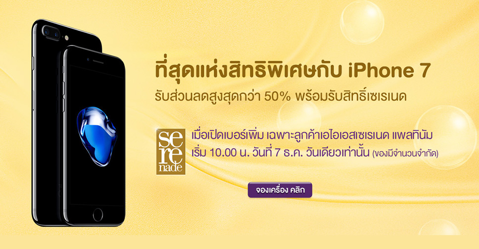 สิทธิพิเศษสำหรับลูกค้า เอไอเอส เซเรเนด แพลทินัมเป็นเจ้าของ iPhone 7 และ iPhone 7Plus รับสิทธิ์ส่วนลดสูงสุดกว่า 50% เมื่อเปิดเบอร์เพิ่ม