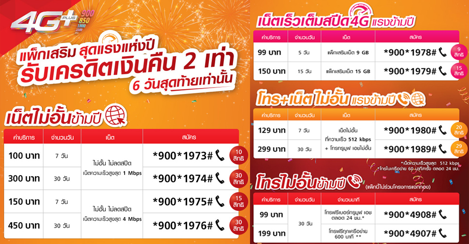 เรียกได้ว่าเป็น 6 วันสุดท้ายของปี 2016 ซึ่งอยู่ในช่วงเทศกาลแห่งความสุข ที่ลูกค้าทรูมูฟ เอชแบบเติมเงินพลาดไม่ได้ กับแคมเปญสุดพิเศษที่จัดมาให้เป็นการส่งท้ายปี โดยมีการจัดแพ็กเกจเสริมสุดแรงแห่งปีมาเอาใจทั้งคนชอบเล่นเน็ตกับเน็ตแรงๆ และคนชอบโทรกับแพ็กเกจโทรสุดคุ้ม ซึ่งมีมาให้เลือกกันถึง 10 แพ็กเกจเสริมสุดพิเศษกันเลยทีเดียว ไม่ว่าจะเป็นเน็ตไม่อั้นข้ามปี , เน็ตเร็วเต็มสปีด 4G แรงข้ามปี , โทร+เน็ต ไม่อั้น แรงข้ามปี และโทรไม่อั้นข้ามปี
