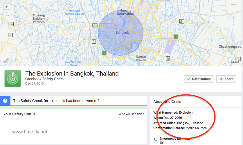 แม้แต่ระบบรายงานความปลอดภัย Security Checkpoint ของ Facebook ยังถูกหลอกให้เปิดใช้งานในพื้นที่กรุงเทพมหานครทันที เพื่อให้ผู้ใช้งาน Facebook ในประเทศไทยยืนยันว่าตนเองปลอดภัยดีหรือไม่ สร้างความวุ่นวายกันไปพอสมควรเลยทีเดียว แต่สุดท้ายกลายเป็นข่าวเก่าเมื่อปีที่ผ่านมานั่นเอง