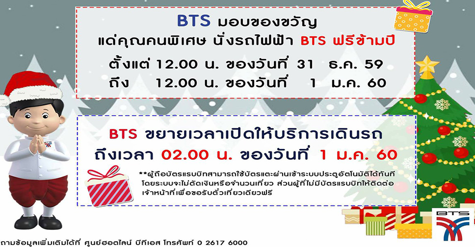BTS และ BRT ให้เดินทางฟรีข้ามปี! ตั้งแต่ 12:00 น. ของวันที่ 31 ธ.ค. 2559 ถึง 12:00 น. ของวันที่ 1 ม.ค. 2560 พิเศษ! คืนส่งท้ายปี บีทีเอสขยายเวลาให้บริการถึง 02:00 น. ของวันที่ 1 ม.ค. 2560 (บีอาร์ทีเปิดให้บริการตามปกติ 06:00-24:00 น.)