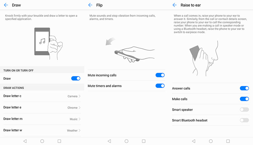 ทั้งแอนิเมชั่นและซาวด์เอฟเฟ็กต์ต่างๆ สามารถเรียกใช้เมนูโปรดเกือบทั้งหมดได้เพียง 3 ขั้นตอน EMUI 5.0 จัดเรียงข้อความ การแจ้งเตือน ภาพถ่ายและวิดีโอ และมีชอร์ทคัตช่วยให้เปิดใช้งาน Wi-Fi ค้นหาแอพและบล็อกการแจ้งเตือนได้รวดเร็วกว่า