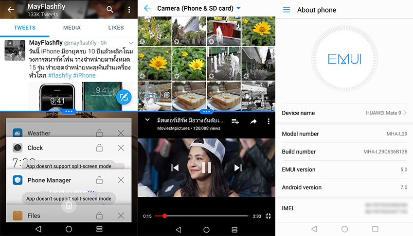 สำหรับสิ่งที่หน้าสนใจของ EMUI 5.0 ที่มาพร้อม Huawei Mate 9 ยังสามารถใช้งาน 2 แอพพลิเคชั่นกันด้วยการแบ่งเป็น 2 หน้าจอ เสียดายที่ไม่รองรับทุกแอพแต่ใช้ได้เยอะพอสมควร
