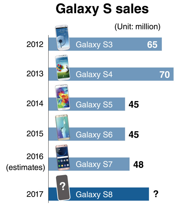 สำนักข่าวในเกาหลีใต้รายงานว่า Samsung Electronics ตั้งเป้าทำตลาดสมาร์ทโฟนระดับเรือธง Galaxy S8 ไว้ที่ 60 ล้านเครื่องภายในปี 2017 โดยคาดว่าจะเปิดตัวทางการประมาณกลางเดือนเมษายนนี้ ซึ่งช้ากว่าตารางเวลาเดิมที่ปกติจะพร้อมปล่อยสู่ตลาดในเดือนมีนาคม