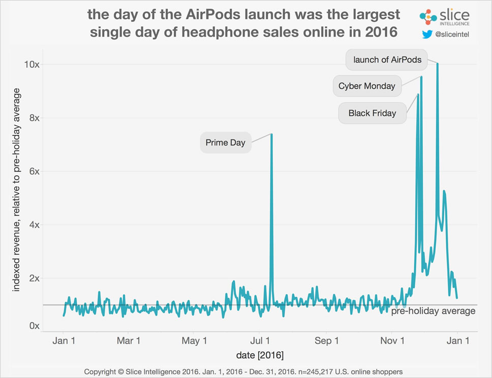 Slice Intelligence ยังพบว่ายอดขาย AirPods ในวันแรกผ่านระบบออนไลน์สูงถึง 10 เท่า จากยอดขายโดยเฉลี่ยของหูฟังในปี 2016 และยังสูงกว่ายอดขายหูฟังในช่วง Amazon Prime Day, Black Friday และ Cyber Monday ที่มีการลดราคาเป็นพิเศษ และลูกค้าที่ซื้อ AirPods ส่วนใหญ่เป็นผู้ชายมากกว่าผู้หญิง นอกจากนี้ การมาของ AirPods ยังทำให้รายได้หูฟังของ Beats ตกลงไปด้วย จากที่เคยได้รับส่วนแบ่ง 24.1% ข้อมูลล่าสุดระบุว่าลดลงมาที่ 15.4%