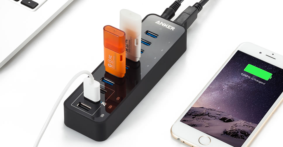 แล็ปท็อปในปัจจุบันโดยเฉพาะอุปกรณ์ประเภทอัลตร้าบุ๊ค ถูกออกแบบให้บางลงเรื่อยๆ เพื่อให้แล็ปท็อปมีขนาดเล็กพกพาสะดวก ซึ่งส่งผลให้พอร์ตเชื่อมต่อต่างๆ ถูกลดจำนวนตามลงไปด้วย ดังนั้น Anker จึงได้แนะนำ USB Data Hub ที่มาพร้อมพอร์ต USB ถึง 10 ช่อง โดยแบ่งเป็น USB 3.0 สำหรับถ่ายโอนข้อมูล 7 ช่อง และอีก 3 ช่อง สำหรับใช้ชาร์ตแบตเตอรี่ให้กับสมาร์ทโฟน