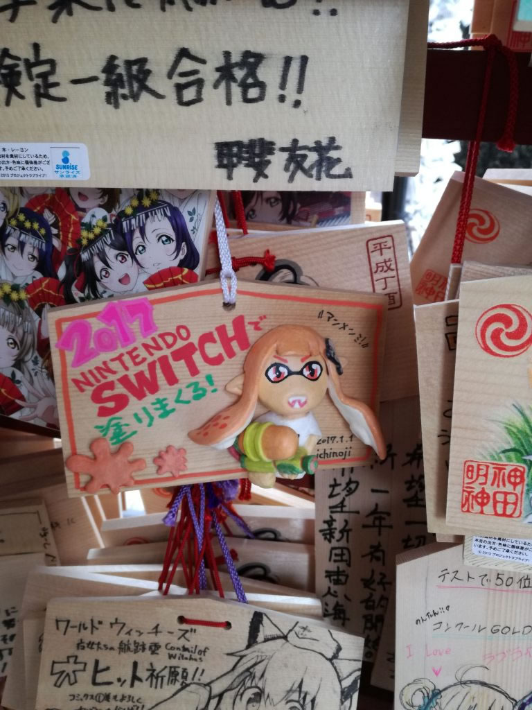 ป้ายคำอธิษฐานขอ Nintendo Switch ถูกแขวนไว้ที่ศาลเจ้า Kanda Myojin เป็นที่ประดิษฐานของเทพเจ้า Daikokuten, Ebisu และ Taira Masakado ซึ่งดูเหมือนจะได้รับความเลื่อมใสเป็นอย่างสูงสำหรับแฟนอนิเมะ และโอตาคุ ซึ่งอาจเป็นเพราะอยู่ใกล้กับย่าน Akihabara แหล่งช้อปปิ้งเครื่องใช้ไฟฟ้าและอุปกรณ์อิเล็กทรอนิกส์