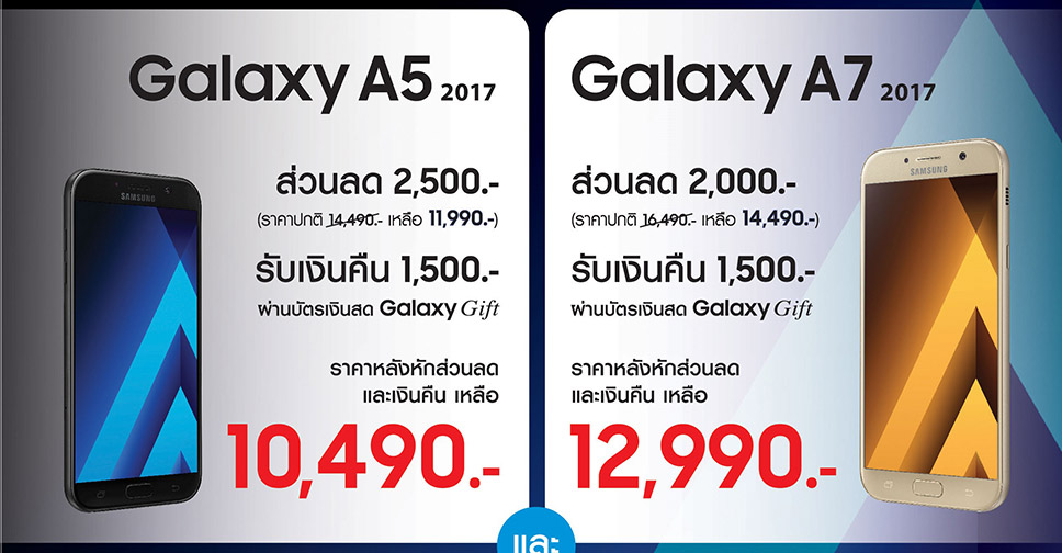 - Galaxy A5 (2017) ราคาปกติ 14,490 บาทรับส่วนลด 2,500 บาท เหลือ 11,990 บาท พร้อมรับเงินคืน 1,500 บาท ผ่านบัตรเงินสด Galaxy Gift ทำให้ราคากลังหักส่วนลดและเงินคืน เหลือเพียง 10,490 บาท