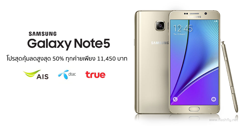 - Galaxy Note 5 64GB ราคา 11,450 บาท จากราคาปกติ 22,900 บาท เมื่อสมัครแพคเกจ 899 ต่อเดือนชำระค่าบริการล่วงหน้า 4,000 บาท คืนส่วนลดนาน 10 เดือน