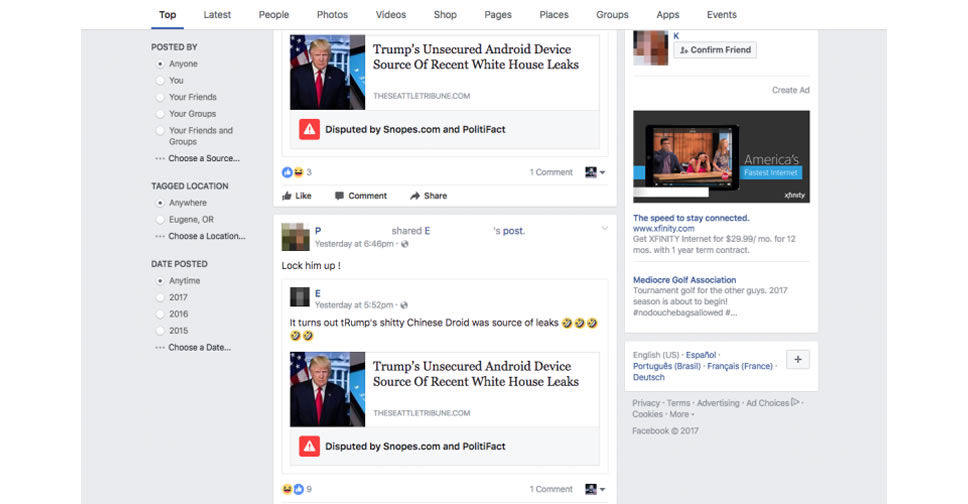 ปลายปีที่แล้ว Facebook ประกาศเพิ่มฟีเจอร์รายงานข่าวปลอม พร้อมติดป้ายเตือนไว้ใต้โพสต์หรือข่าวที่ถูกรายงาน ล่าสุดพบว่าป้ายแจ้งเตือนเริ่มแสดงผลแล้วกับผู้ใช้งานบางราย โดยโพสต์ที่ถูกรายงานและผ่านการพิจารณาจากหน่วยงานบุคคลที่สาม จะถูกติดป้ายสัญลักษณ์คำเตือนสีแดง พร้อมข้อความ “Disputed by Snopes.com and PolitiFact” เพื่อให้ผู้ใช้งานได้ตระหนักก่อนคลิกเข้าไปอ่าน