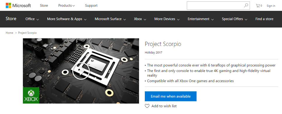 ถึงตอนนี้ Project Scorpio ยังเป็นคอนโซลที่มีความลึกลับ แต่ระบบออนไลน์ของ Microsoft Store เริ่มจัดทำหน้าสินค้าแล้ว โดยระบุว่าจะพร้อมเปิดตัวทางการในช่วง Holiday 2017 หรือปลายปีนี้ และมีปุ่ม Email me when available ให้ผู้ที่สนใจลงทะเบียน Email เพื่อรอรับข่าวสารหรือการแจ้งเตือนเมื่อ Project Scorpio พร้อมวางจำหน่าย